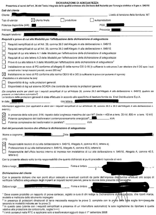 Tornando al nostro cliente abbiamo verificato che la situazione era molto GRAVE: il cliente non aveva la cabina a norma, o meglio non aveva inviato al distributore (chi trasporta l’energia elettrica dalla rete fino alla cabina) un documento che si chiama “dichiarazione di adeguatezza” (di seguito un esempio di questo documento) che attesta la presenza di determinati requisiti tecnici.
