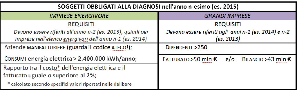Dal 2015 ci sono due categorie di imprese obbligate a fare una diagnosi energetica almeno ogni 4 anni: le aziende iscritte all’elenco energivori e le grandi imprese.