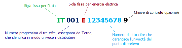 Il codice POD (Point of Delivery) è un codice alfanumerico che identifica univocamente il punto fisico in cui il Distributore consegna l’energia elettrica al cliente finale. Il codice POD è sempre riportato sulla bolletta o fattura, di seguito il suo significato: